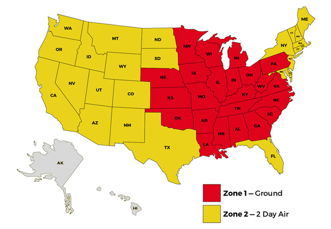- Zone 1 (Ground) = $26.00 shipping fee // Zone 2 (2 Day Air) = $110.00 shipping fee